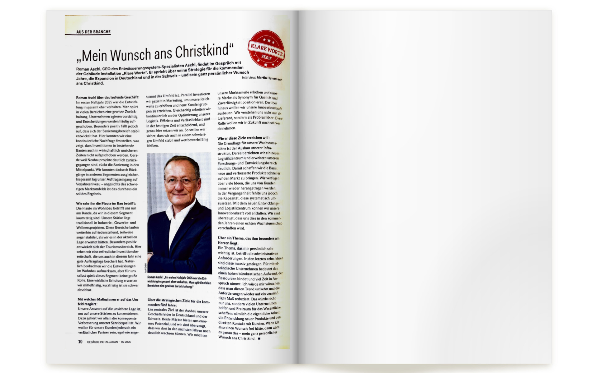Roman Aschl, CEO des Entwässerungssystem-Spezialisten Aschl, findet im Gespräch mit der Gebäude Installation „Klare Worte“. Er spricht über seine Strategie für die kommenden Jahre, die Expansion in Deutschland und in der Schweiz- und sein ganz persönlicher Wunsch ans Christkind.