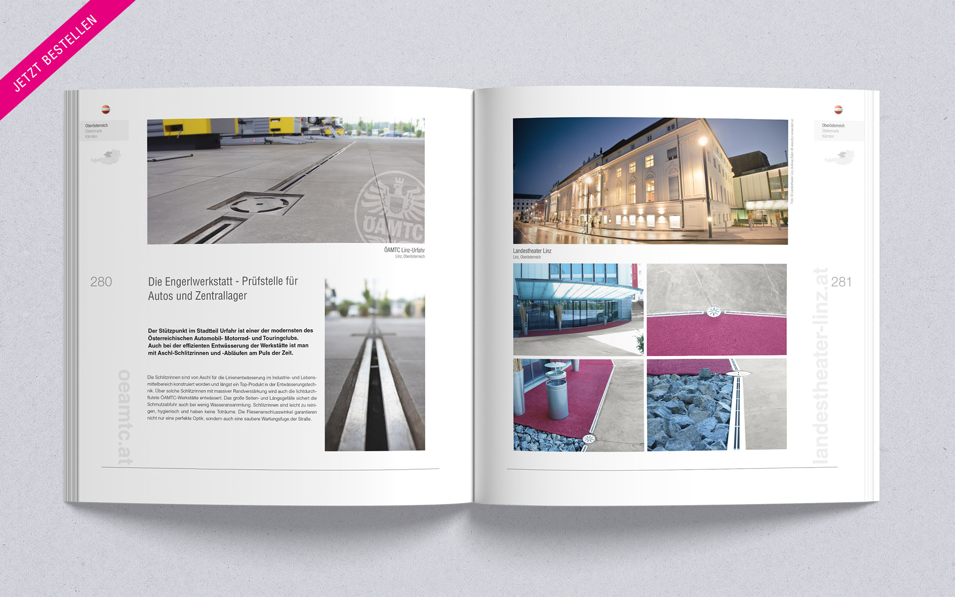 Wer hätte gedacht, dass Entwässerungstechnik so schön sein kann? Unsere zahlreichen Referenzen beweisen eindrucksvoll, dass bei moderner Entwässerungstechnologie neben der effizienten Produktlösung auch die elegante Optik eine zentrale Rolle spielt. Die Referenzen werden mit vielen bunten Fotos, die unsere eingebaute Entwässerungstechnik zeigen, illustriert. Ideal zum Vorzeigen beim Kunden, als Inspiration für Ihre Planung oder einfach nur zum Schmökern.