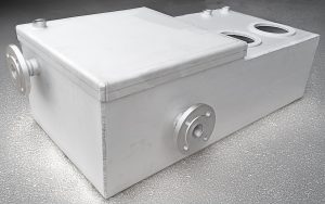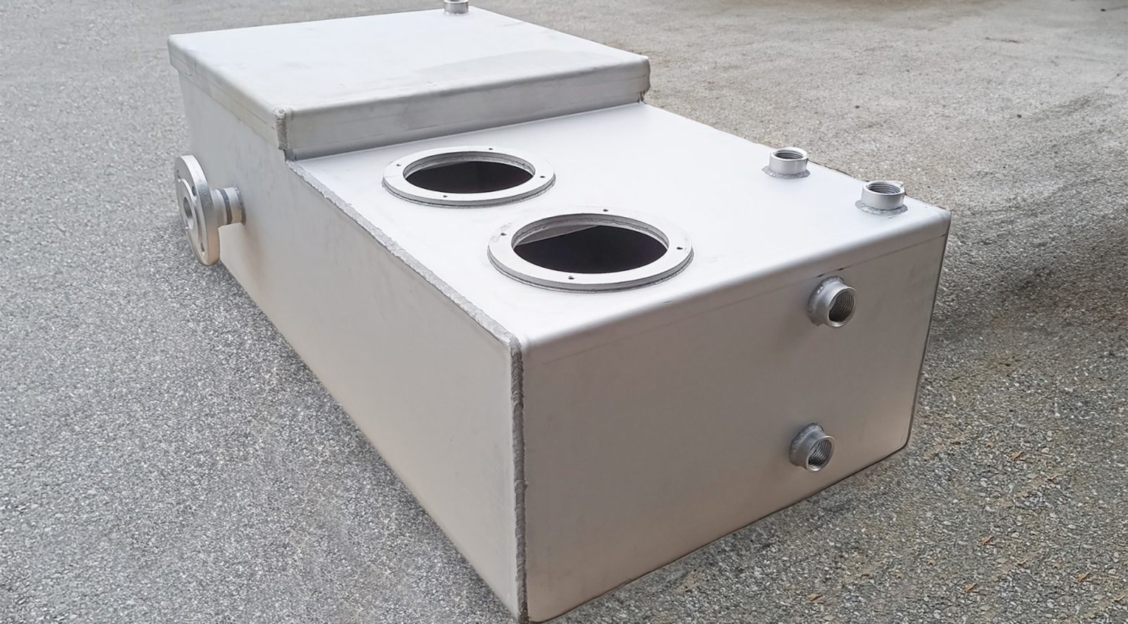 Sämtliche Anschlüsse für Verrohrung und Pumpen wurden vorgesehen. Die Anschlussflansche für die beiden Pumpen wurden per Wasserstrahl vorgefertigt und aufgeschweißt. Die M6er Innengewinde erlauben eine direkte und flotte Montage der beiden Pumpen.