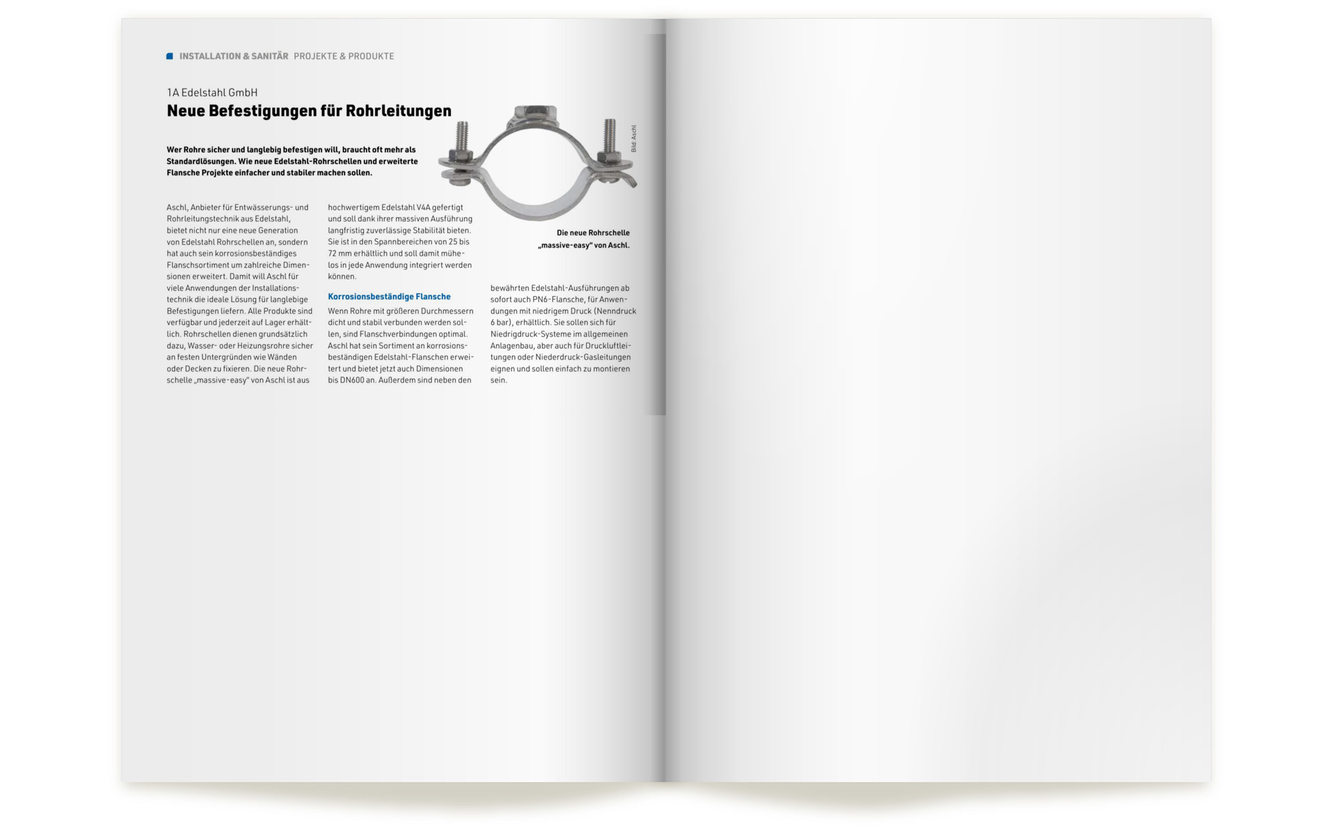 Aschl, Anbieter für Entwässerungs- und Rohrleitungstechnik aus Edelstahl, bietet nicht nur eine neue Generation von Edelstahl-Rohrschellen an, sondern hat auch sein korrosionsbeständiges Flanschsortiment um zahlreiche Dimensionen erweitert. Damit will Aschl für viele Anwendungen der Installationstechnik die ideale Lösung für langlebige Befestigungen liefern. Alle Produkte sind verfügbar und jederzeit auf Lager erhältlich. Rohrschellen dienen grundsätzlich dazu, Wasser- oder Heizungsrohre sicher an festen Untergründen wie Wänden oder Decken zu fixieren. Die neue Rohrschelle „massive-easy“ von Aschl ist aus hochwertigem Edelstahl V4A gefertigt und soll dank ihrer massiven Ausführung langfristig zuverlässige Stabilität bieten. Sie ist in den Spannbereichen von 25 bis 72 mm erhältlich und soll damit mühelos in jede Anwendung integriert werden können.