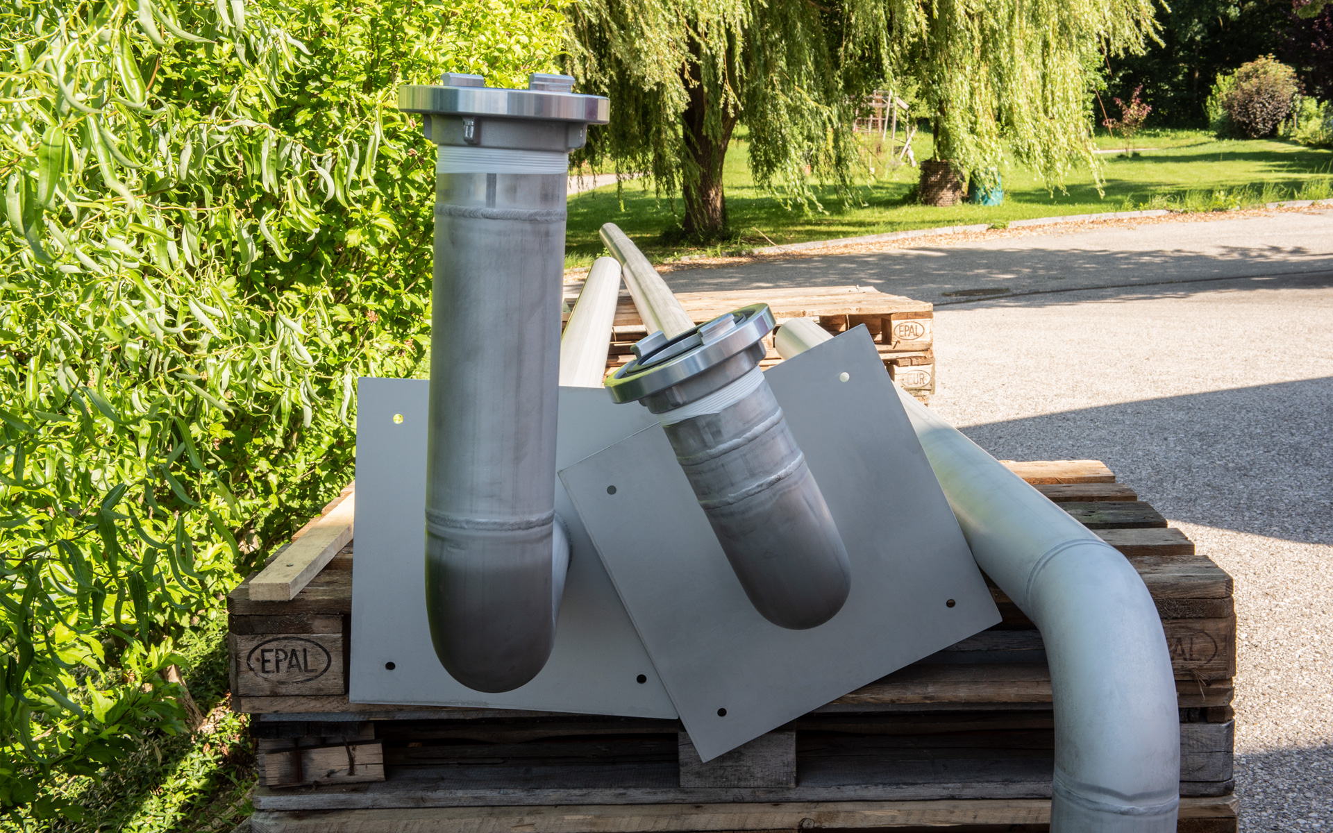 Nach Kundenseitigen Skizzen haben wir die CAD-Planung vervollständigt. Besonders herausfordernd war hier die Überlänge (fast 9m) die einen Sondertransport zum Kunden erforderte. Mittels formiert erfolgten WIG-Schweißprozess wurden die Rohre, Bögen und Anschweißnippel 114,3 x 2,0mm zusammengefügt und im Anschluss im Vollbad gebeizt.