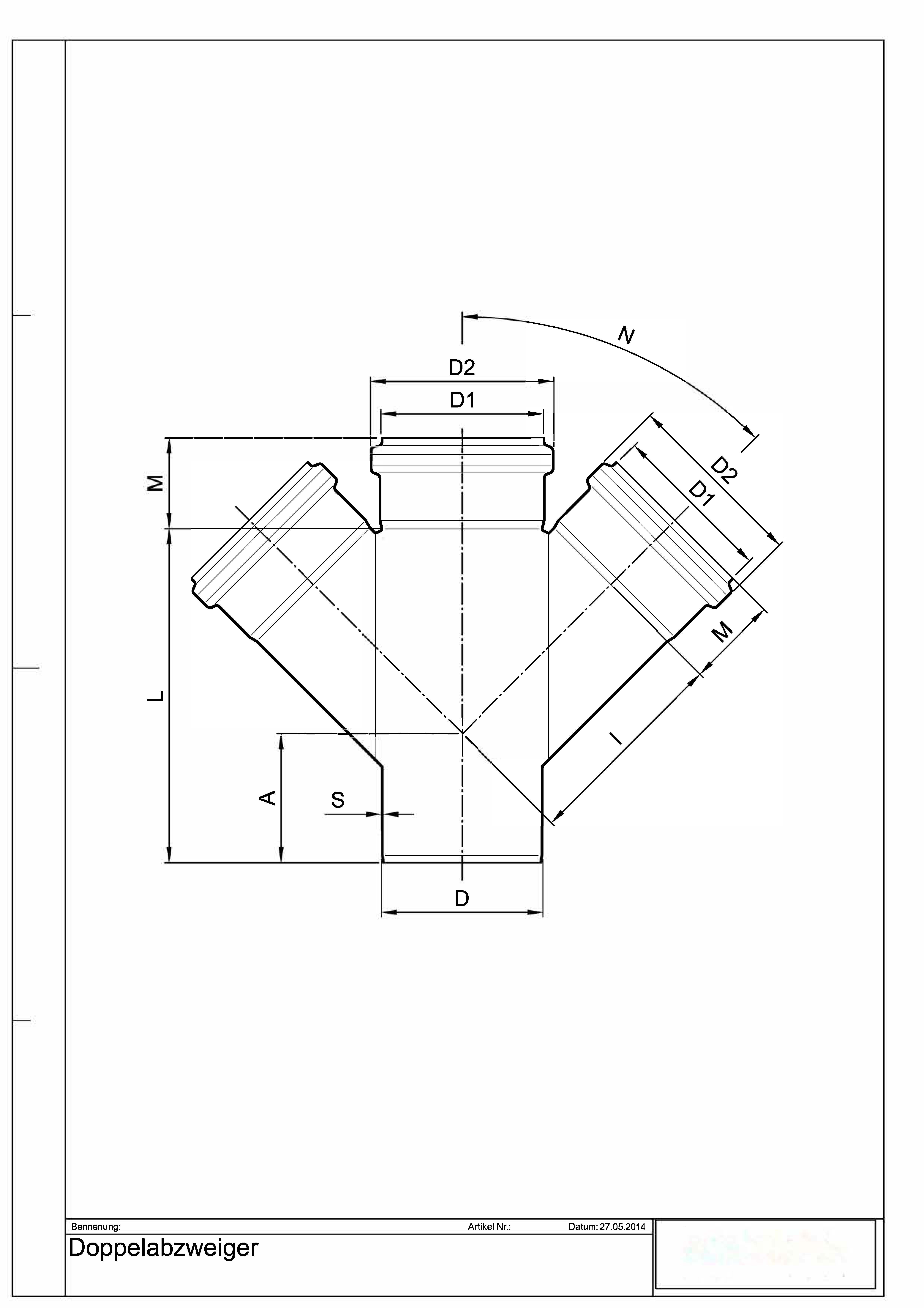 Doppelabzweiger-NIROPIPE 45° DN50, gefertigt aus Material Edelstahl V4A, 2-lippige EPDM Dichtung an Muffenanschlüssen, mit Verjüngung am Rohrende