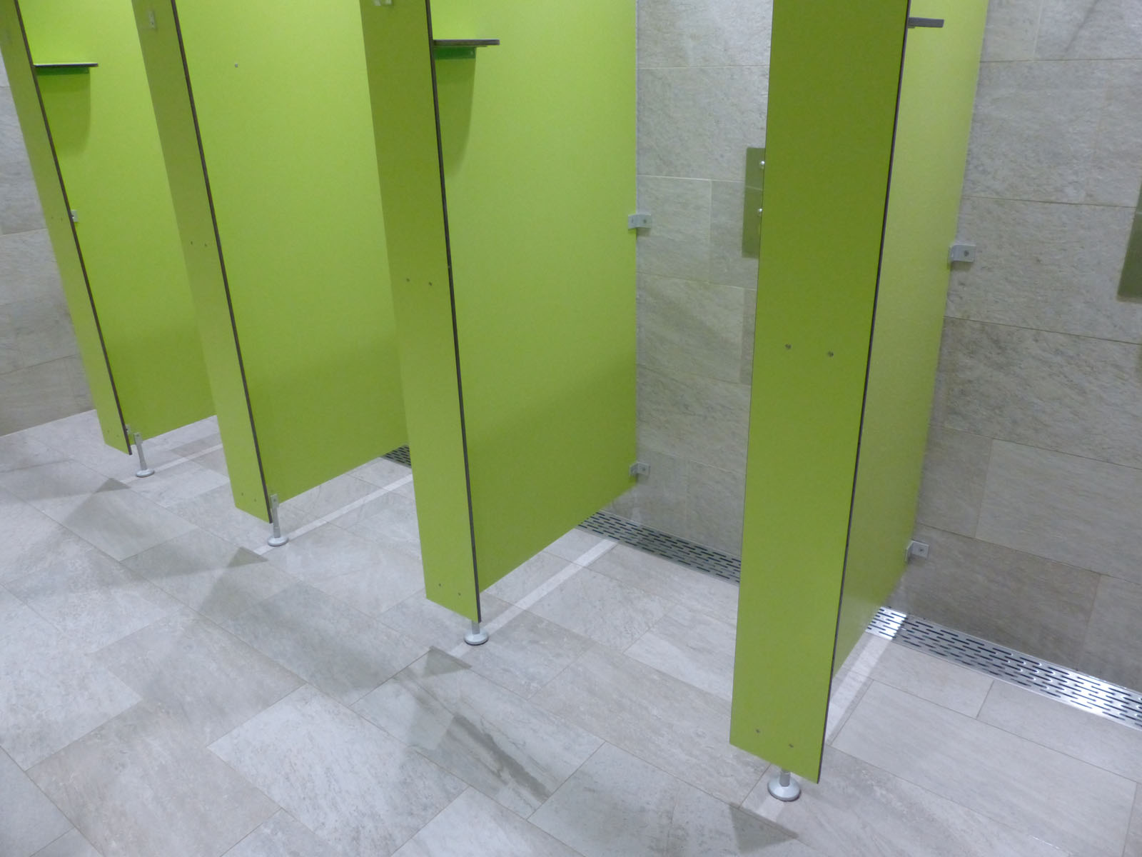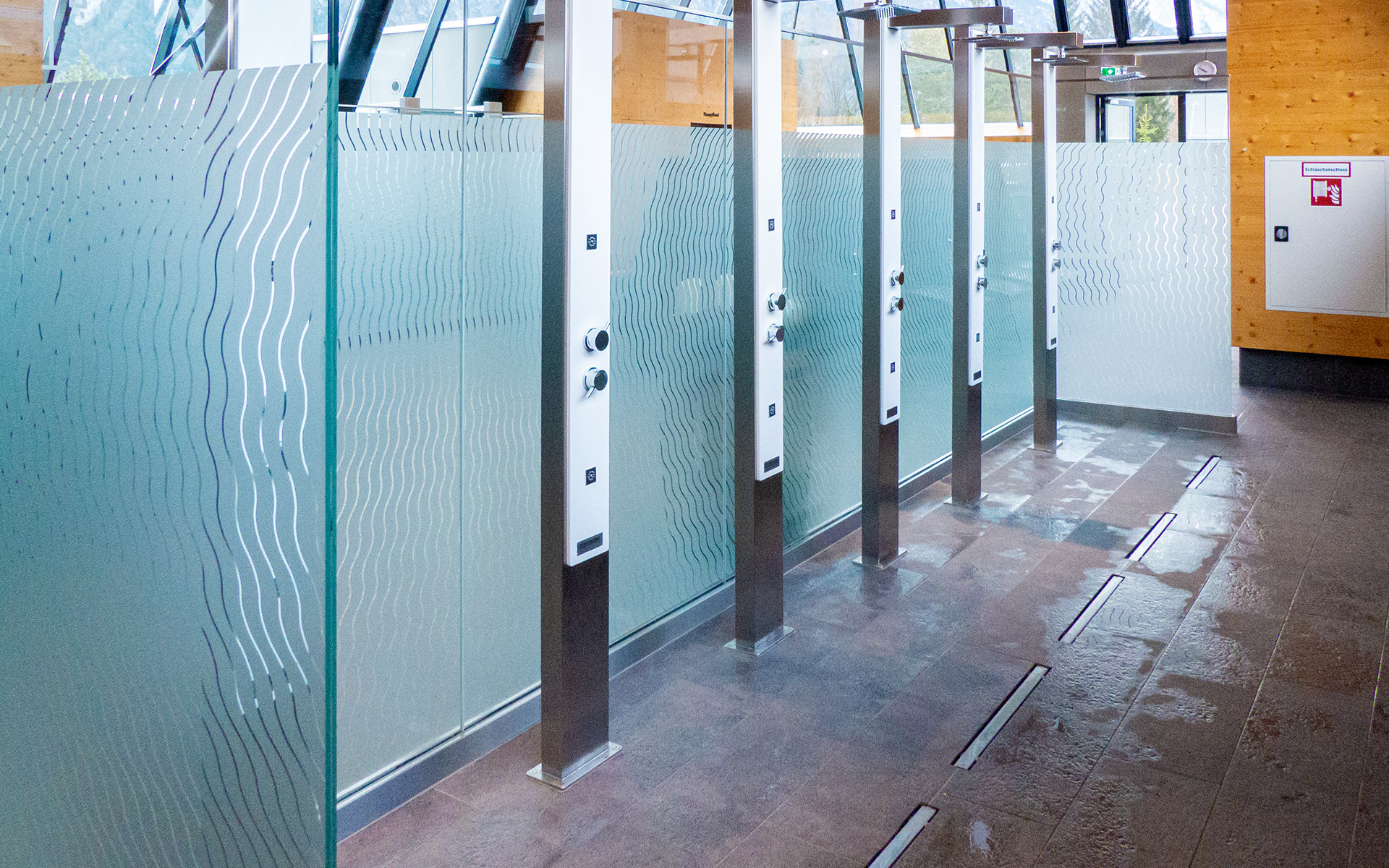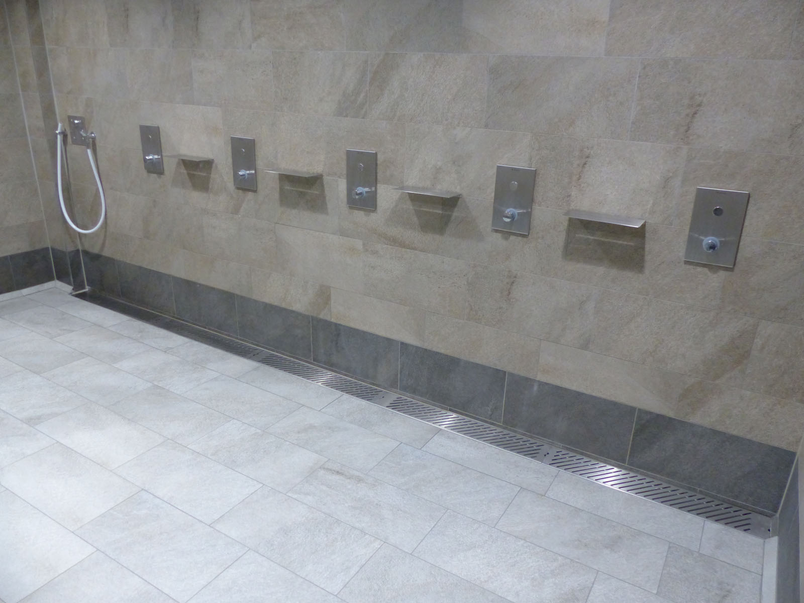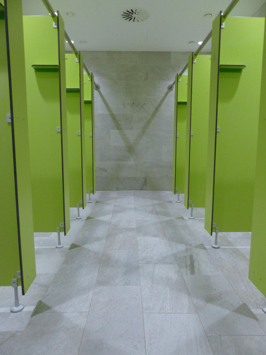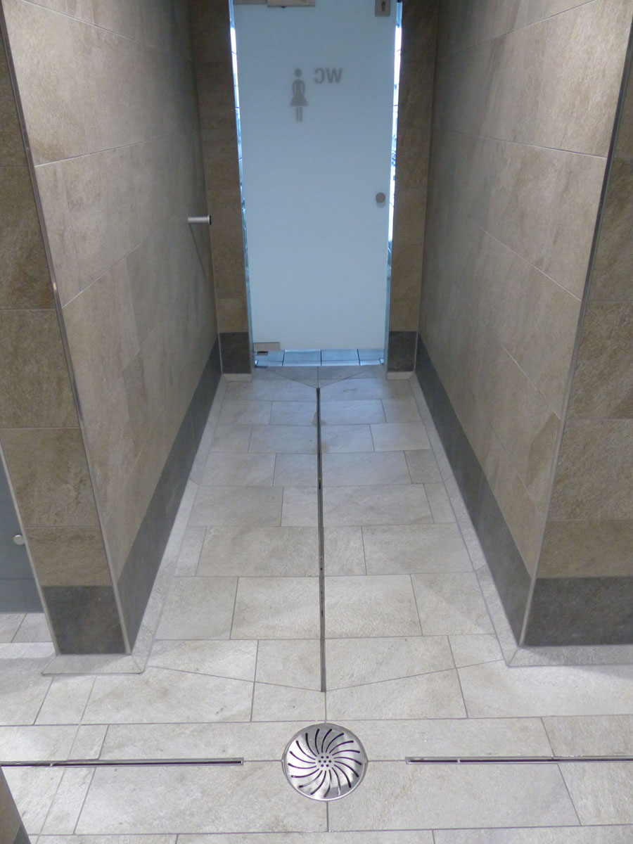 ASCHL fertigte für das WC mehrere spezielle Kastenwannen nach Maß mit dreiseitigem Klebeflansch und einseitigem Hochzug an. Alle diese Kastenwannen sind auch mit Stöckelschuhen problemlos begehbar und garantieren, dass die Personen weitgehend im Trockenen stehen. Zudem wurden Wandpaneele nach Maß mit Ausnehmungen geliefert.
