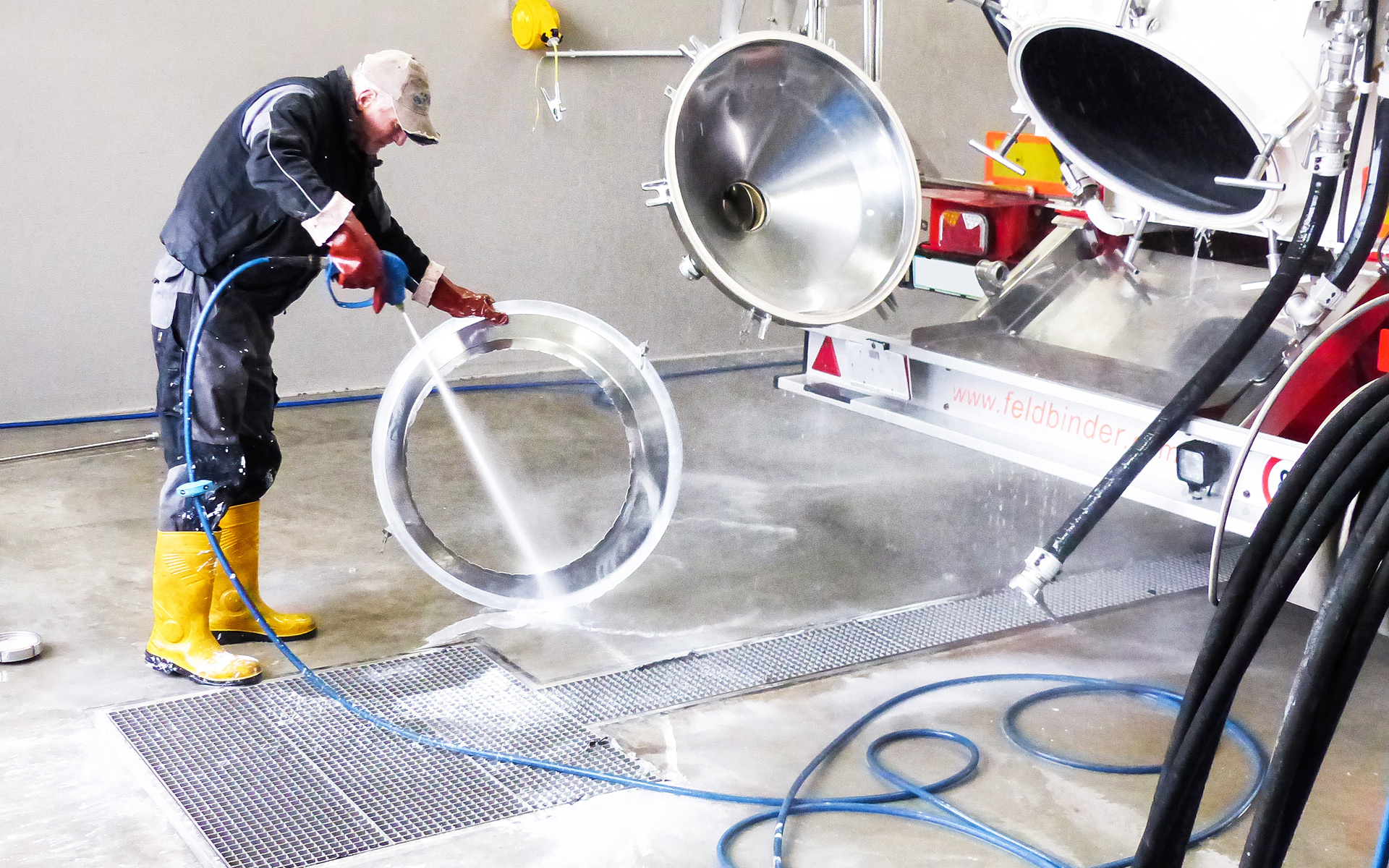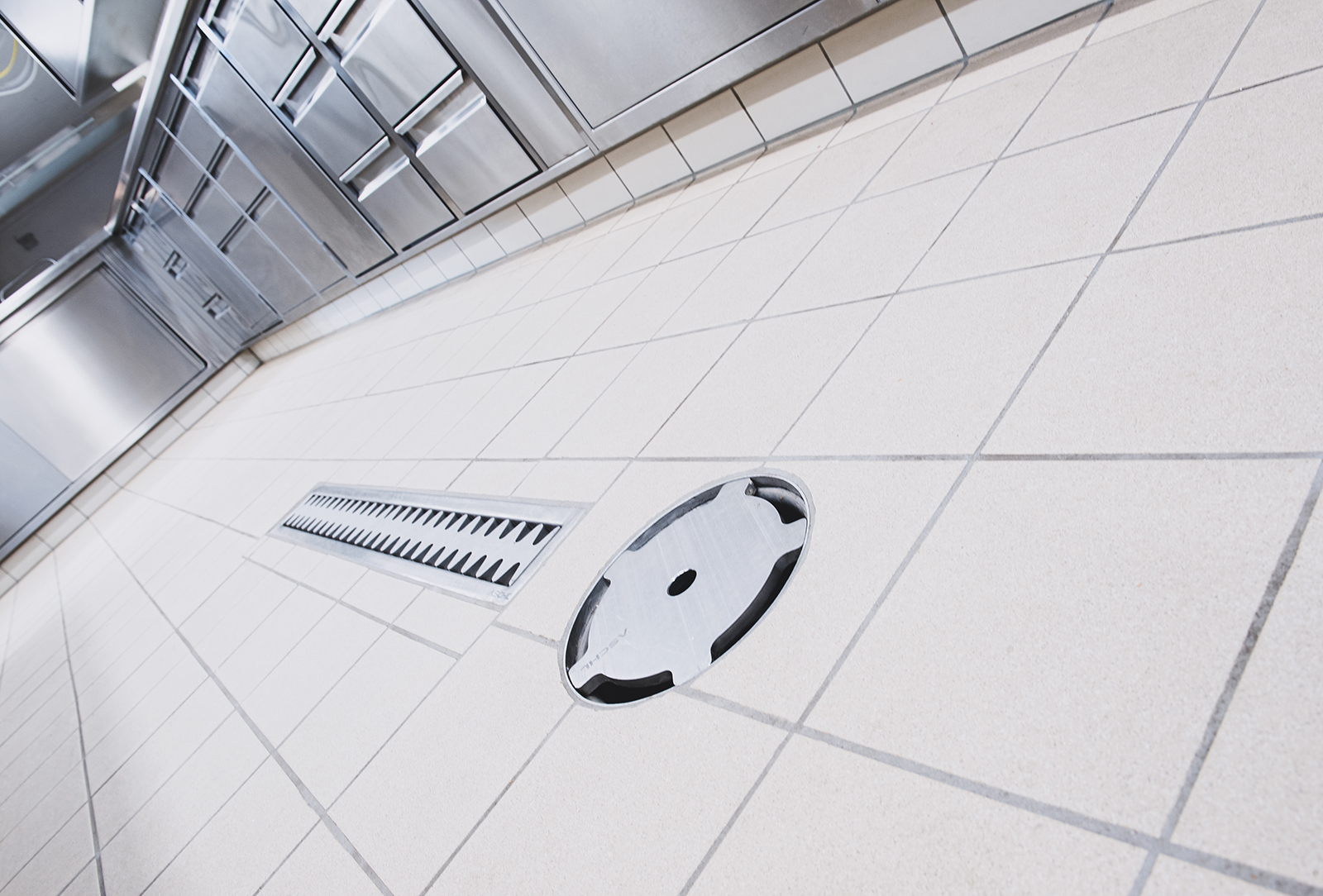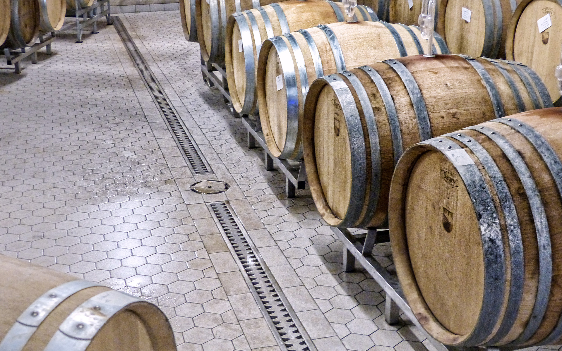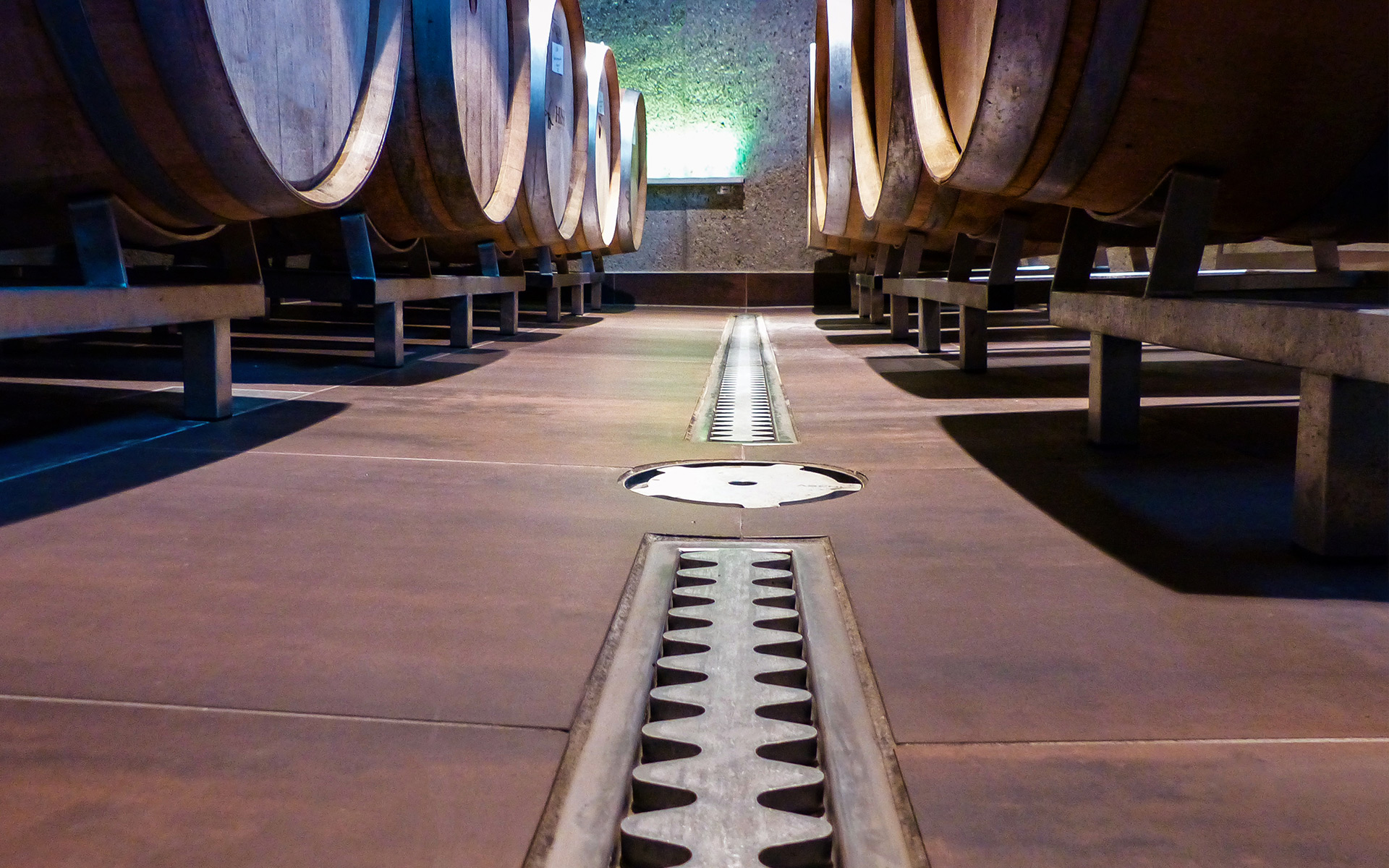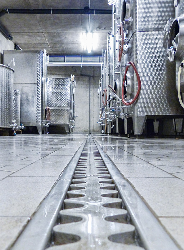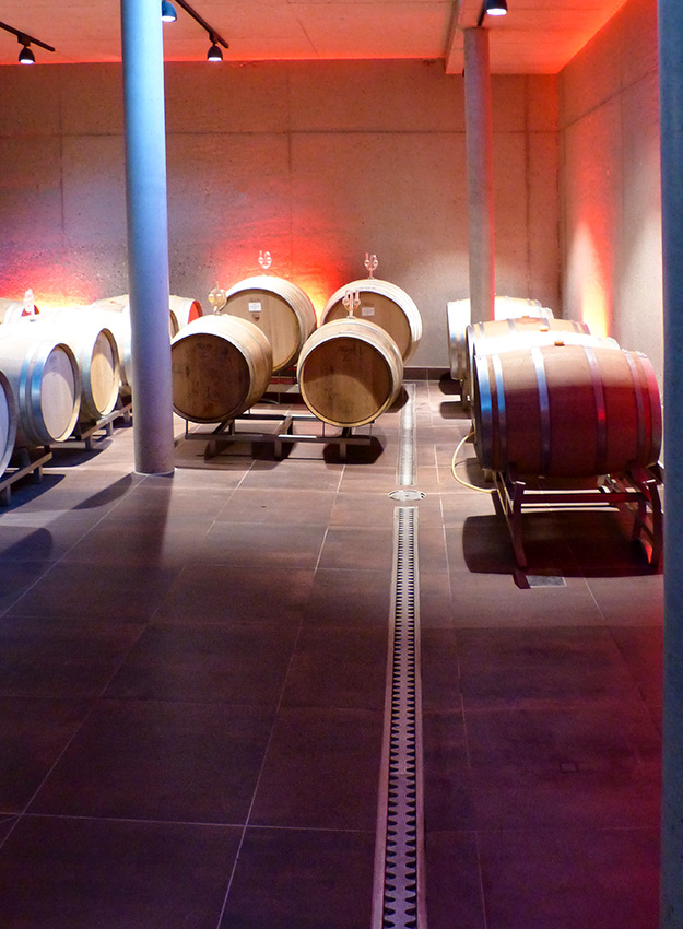 Anspruchsvoll sind Anna Diesslin und das Kiefer-Team auch bei der Technik. Deshalb sind im neuen Keller randverstärkte Kombirinnen und Bodenabläufe von ASCHL eingebaut worden. Ebenso in der Lagerhalle und im Rampenbereich, dort wurden die Flansche den stärkeren Fliesen angepasst. „Wir sind hochzufrieden, das Wasser läuft einwandfrei ab, die Rinnen lassen sich sehr gut und schnell reinigen“, schildert die Kellermeisterin. Das sei ein großer Vorteil im Arbeitsalltag, „denn wir haben immer alle Hände voll zu tun!“