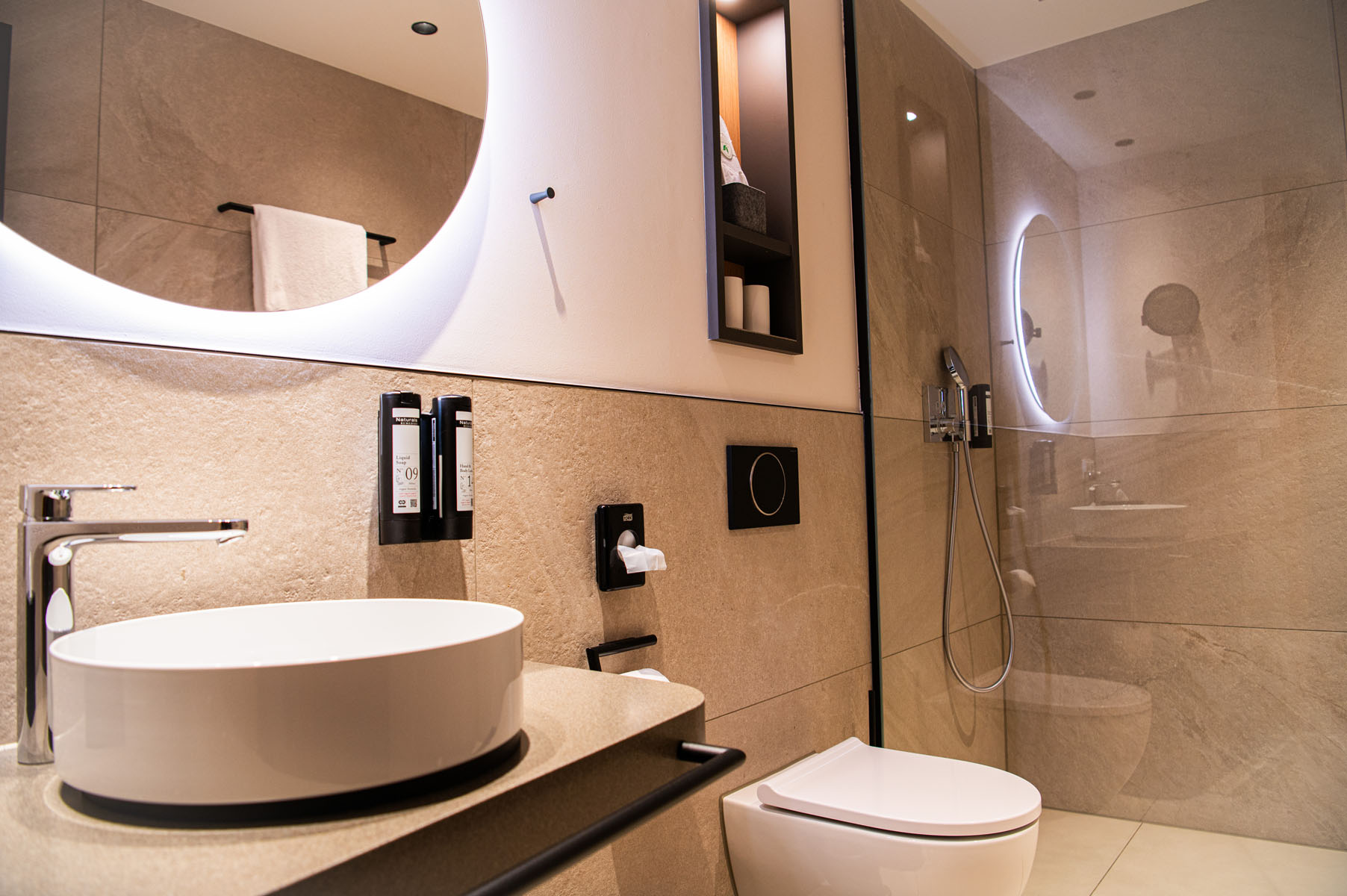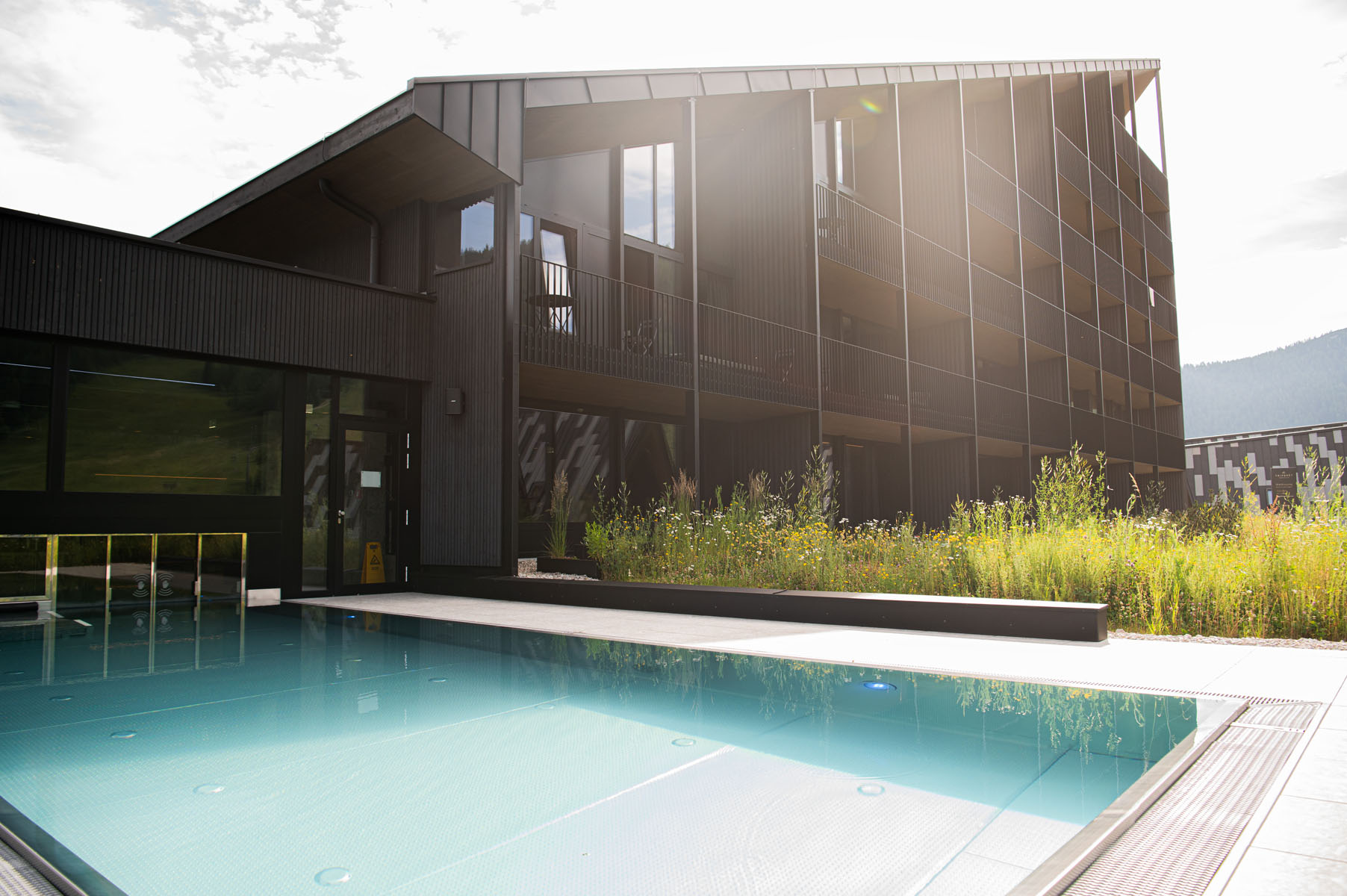 Was das Haus auszeichnet, ist der Blick fürs Ganze und fürs Detail. Nachhaltigkeit reicht von der eigenen Landwirtschaft über ein Biomasse-Heizkraftwerk bis hin zu durchdachten Mobilitätsangeboten. Auch im Wellnessbereich setzt man auf langlebige Qualität: Dort kommt die Sanitärrinne SPArin von Aschl zum Einsatz – millimetergenau verlegt, fugenlos eingebunden und zuverlässig in Funktion, Hygiene und Optik.