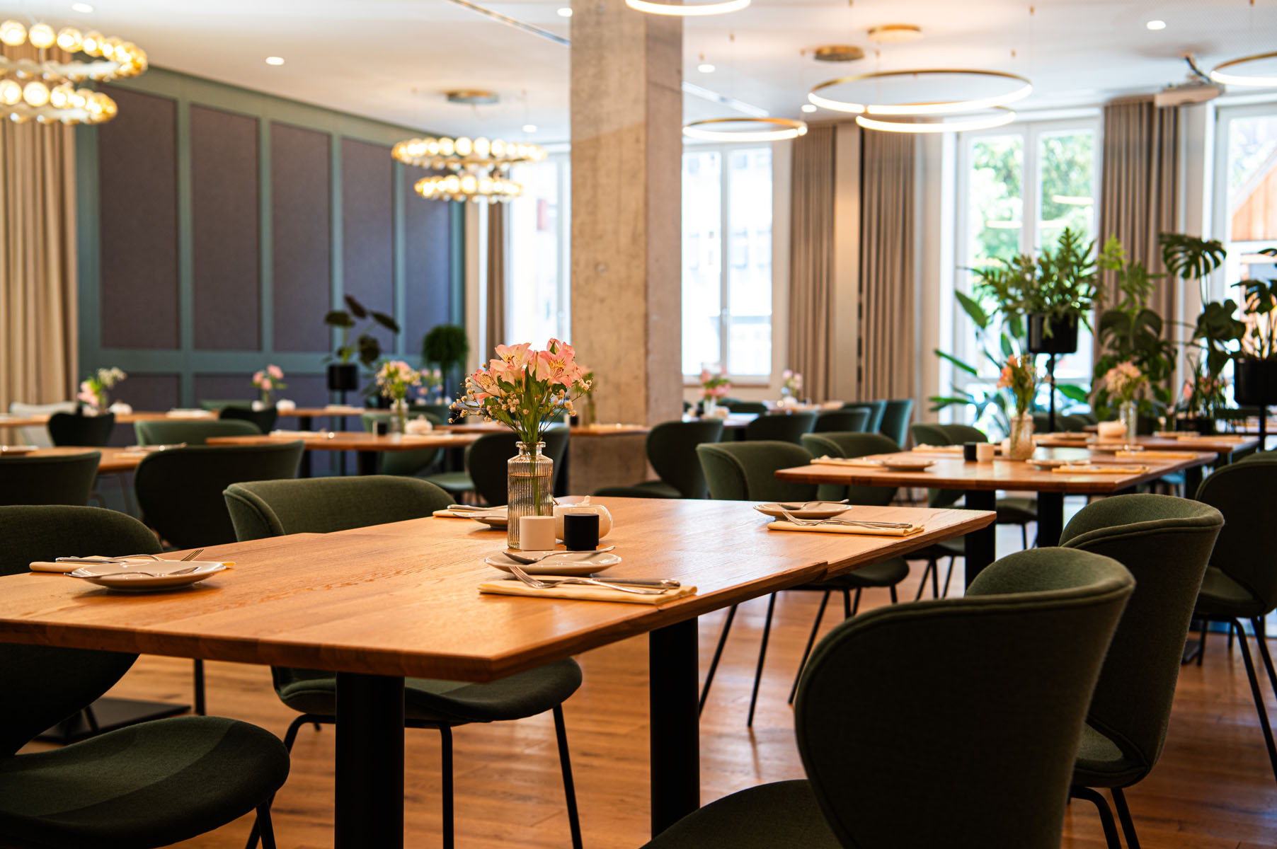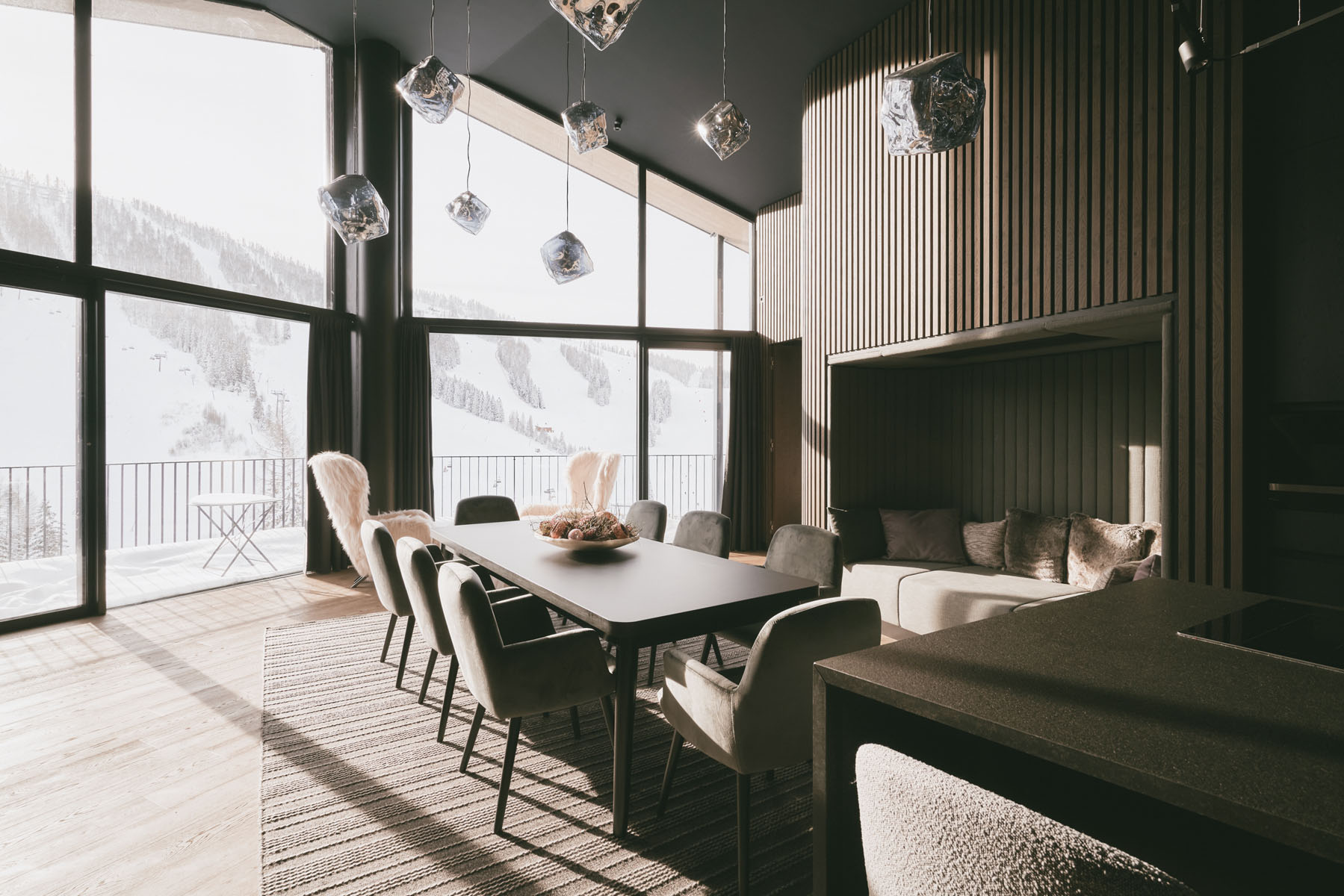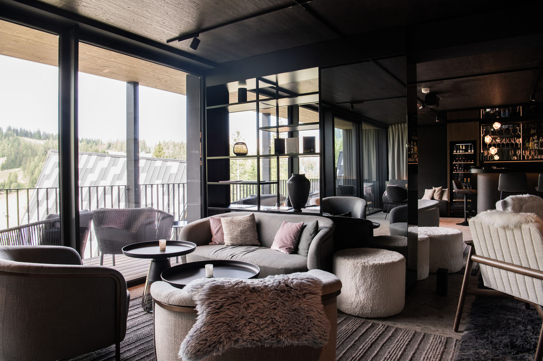 Die 56 großzügigen Zimmer und Suiten, darunter die neuen ALMSINFONIE-Suiten, kombinieren modernes Design mit natürlichen Materialien. Holz, Stein, Glas und Stoffe in warmen Tönen schaffen Räume, die ruhig wirken und dennoch lange in Erinnerung bleiben. Viele Suiten verfügen über eigene Saunen, Panoramablick und Platz für gemeinsame Zeit oder bewusste Ruhe.