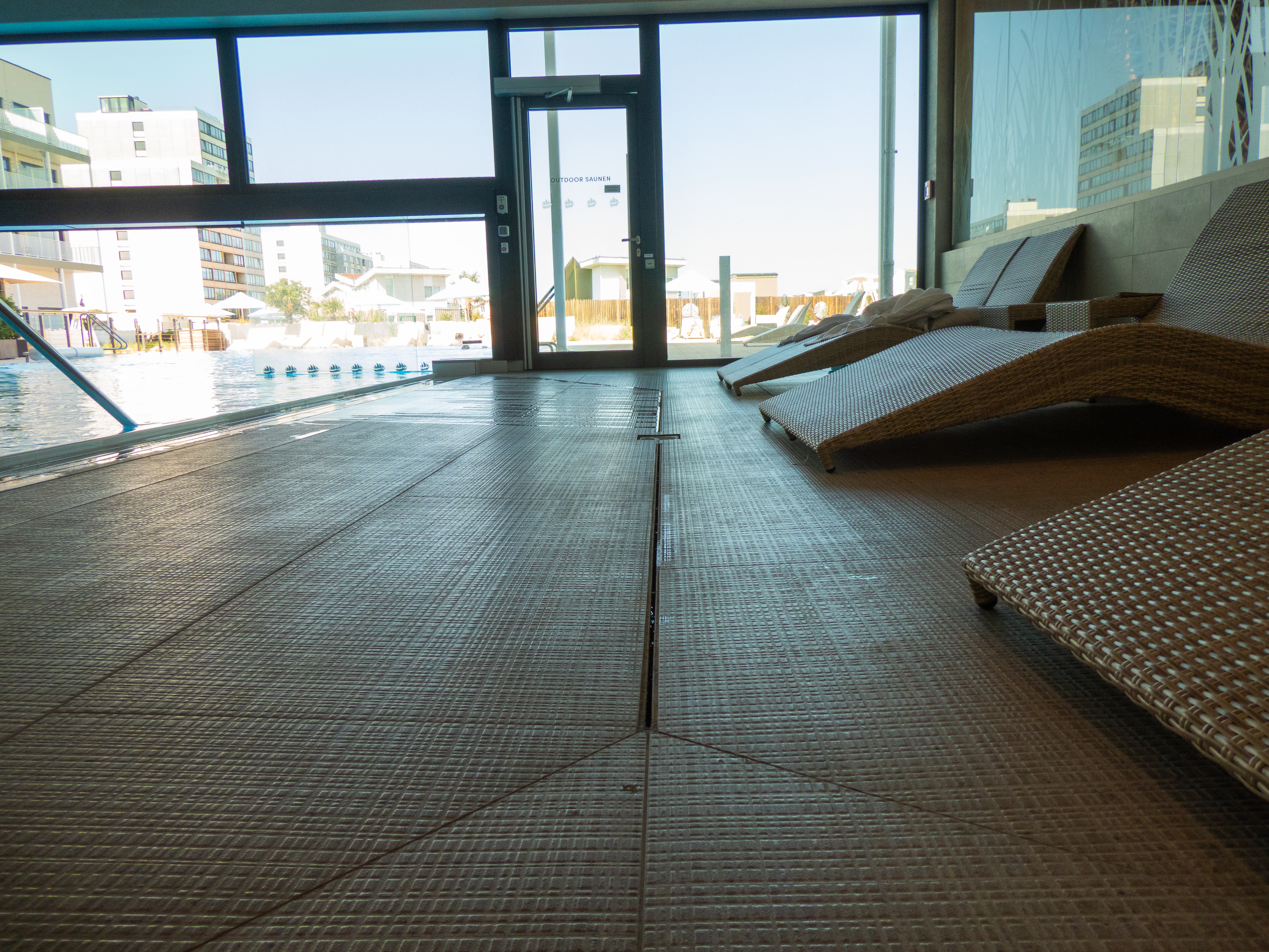 Auch technisch ist vieles auf höchste Qualität abgestimmt: Im Spa-Bereich gewährleisten SPArin-Badrinnen sowie verfliesbare SINKclear Midi-Abläufe von Aschl verlässliche chlorbeständige, langlebige Entwässerung – exakt auf die Anforderungen abgestimmt, dezent im Auftritt, aber entscheidend fürs Wohlgefühl.