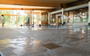 Nach zwei Jahren Bauzeit hat die Gemeinde Hilders ihr Freizeitbad Ulsterwelle wieder eröffnet. Herz der Anlage ist das Kombibecken mit angenehmen 29° Wassertemperatur. Eingebaut wurde hier die Badrinne SPArin von Aschl – eine technisch unschlagbare Lösung, die zugleich barfußbegehbar ist. Ihr Klebeflansch liegt 25 Millimeter unterhalb der Fußbodenoberkante, sodass die stärkeren Fliesen perfekt angebunden werden konnten. Das Ergebnis: höchste Funktionalität, verlässliche Hygiene und ein Plus an Sicherheit.
